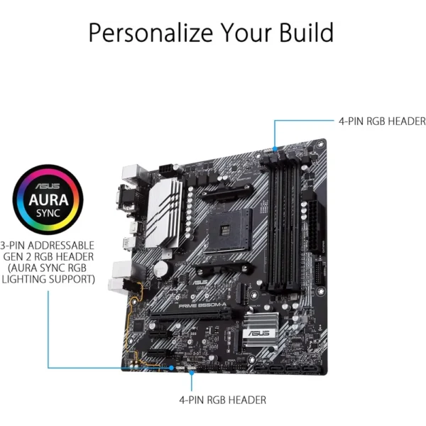 ASUS reinforces the PRIME B550M-A (WIFI) II with its 5X Protection III. This suite of hardware safeguards includes overvoltage protection and durable components. A stainless-steel back I/O panel resists corrosion. SafeSlot Core provides stronger PCIe slot retention. Personalize your system aesthetics with Aura Sync RGB. Synchronize lighting effects across compatible strips and components for a unified look. Build your efficient, powerful, and stylish PC with this capable motherboard.