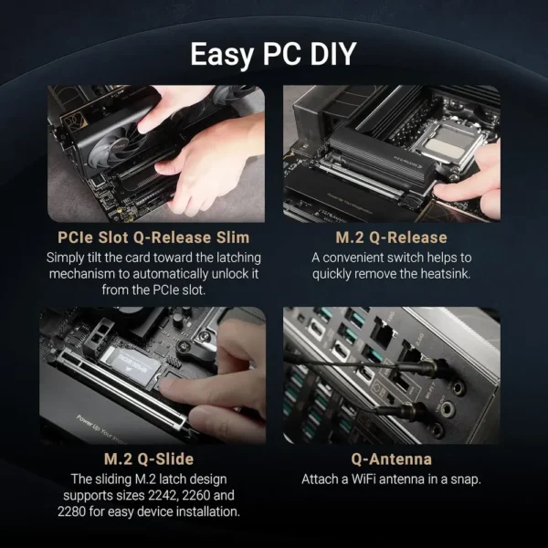 - DIY-Friendly Features – PCIe Slot Q-Release Slim, M.2 Q-Latch, Q-Dashboard, and pre-mounted I/O shield simplify installation