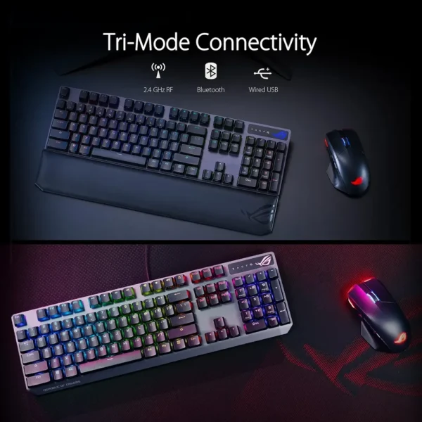 ASUS ROG Strix Scope NX redefines wireless gaming performance with pro-grade features and versatile connectivity. This wireless deluxe mechanical keyboard supports three connection modes—2.4GHz RF for low-latency gaming up to 60 hours, Bluetooth for multi-device productivity, and USB wired for zero-delay input.