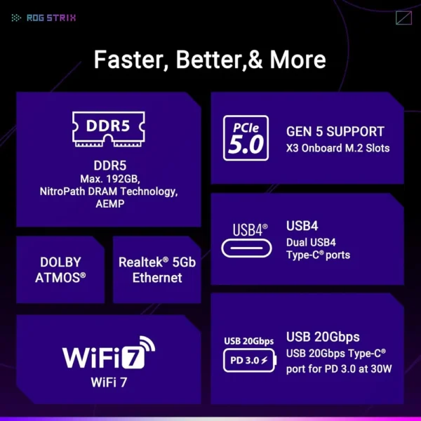 Provides extensive connectivity, including dual USB4® ports, WiFi 7, 5Gb Ethernet, and five M.2 slots with PCIe 5.0 support.