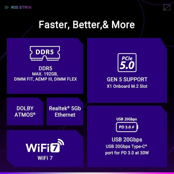 Connectivity is boundless. You get dual Thunderbolt 4 USB Type-C ports on the rear I/O. A front-panel USB 20Gbps Type-C connector supports Quick Charge 4+ up to 60W. Onboard Wi-Fi 7 (802.11be) delivers lightning-fast wireless networking. For storage, three PCIe 5.0 M.2 slots and three PCIe 4.0 M.2 slots provide incredible speed, all covered by substantial cooling solutions. ASUS-exclusive technologies like AI Overclocking simplify setup and dramatically improve performance. The DIY-friendly design includes features like PCIe Slot Q-Release Slim and the new M.2 Q-Latch, making your build process easier and faster. This motherboard truly elevates your entire PC experience.