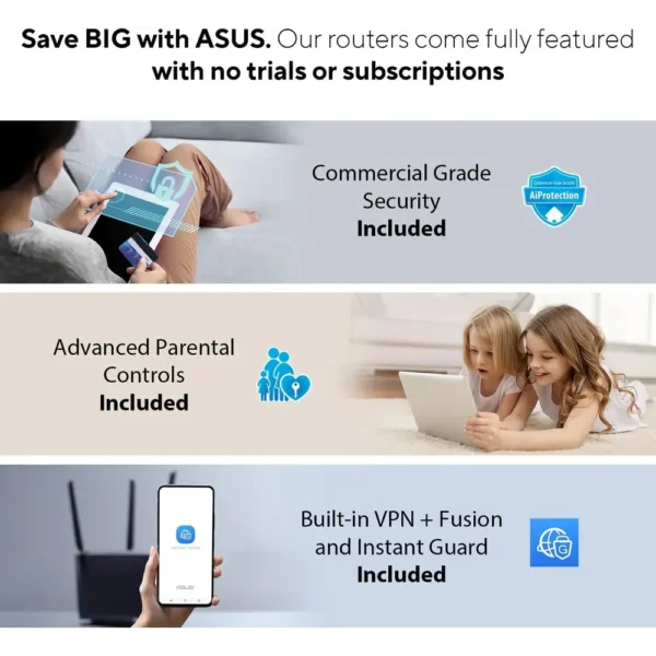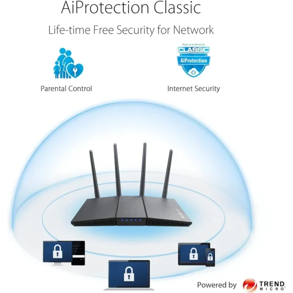 - Enjoy subscription-free security via AiProtection Classic (powered by Trend Micro) and secure remote access with Instant Guard VPN.