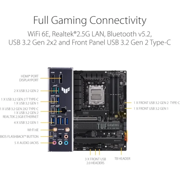 Gaming immersion is key. The onboard WiFi 6E technology provides ultrafast wireless networking, and the Realtek 2.5 Gb Ethernet ensures smooth, lag-free wired gameplay. The exclusive Two-way AI Noise Cancelation utility helps remove distracting background noise from both your mic and incoming audio. This keeps communication crystal-clear during intense games. The board undergoes rigorous endurance testing using military-grade components. This rigorous testing ensures it delivers the dependability and stability that defines the entire TUF GAMING series.