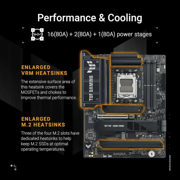 Demand more from your gaming and AI-PC build. The ASUS TUF GAMING X870E-PLUS WIFI7 motherboard meets that challenge head-on. This platform delivers a foundation of unshakable stability and cutting-edge performance. It harnesses the full power of AMD Ryzen 9000, 8000, and 7000 Series processors. Military-grade components and rigorous testing ensure this board survives marathon gaming sessions and intense workloads. A robust 16+2+1 teamed power stage design supplies clean, stable energy to your CPU. An 8-layer PCB and massive VRM heatsinks keep temperatures firmly in check.