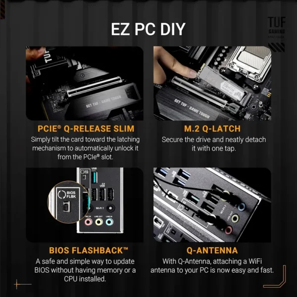 • Benefit from a DIY-friendly design with Q-Release, Q-Latch, and BIOS FlashBack, making your build with the ASUS TUF GAMING X870E-PLUS WIFI7 straightforward.