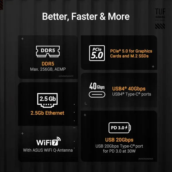 • Experience next-gen speed with PCIe 5.0 for graphics, dual PCIe 5.0 M.2 slots, and ultra-fast Wi-Fi 7 & dual USB4 connectivity on the ASUS TUF GAMING X870E-PLUS WIFI7.