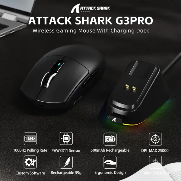 ATTACK SHARK G3 Pro Black Wireless Gaming Mouse with RGB Charging Dock – 59g, PAW3311 25K DPI, Tri-Mode