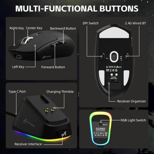 Elevate your desk setup with the included magnetic RGB charging dock that keeps your ATTACK SHARK G3 Pro Black powered and ready.