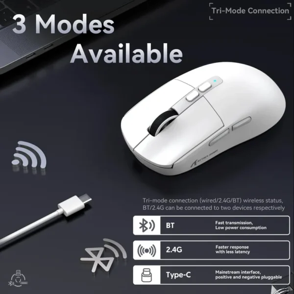 Tri-mode connection lets you switch between devices with ease. Use 2.4G mode when gaming, Bluetooth while working, or USB-C when you want stable data flow. Five programmable buttons and driver support give you more control and let you create custom functions.