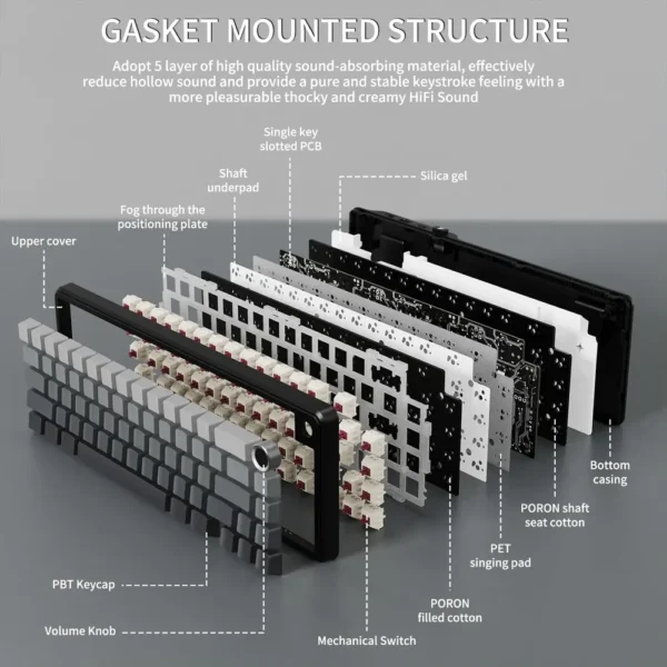 Experience the superior feel of a gasket-mounted keyboard. The X66Â incorporates five layers of sound-absorbing material. This includes PORON foam and an IXPE switch pad. This meticulous construction provides a satisfyingly creamy, thocky sound. It also ensures a soft and elastic typing experience.