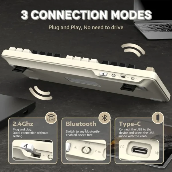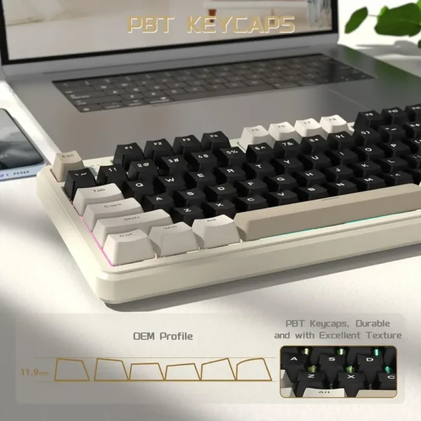 Textured PBT keycaps resist shine, oil, and wear—even after months of heavy use. The OEM profile offers a familiar, comfortable key height, while dual-angle feet let you find your ideal typing posture. A 4000mAh battery powers days of wireless use, and smart sleep modes extend life when idle. Plus, full Mac and Windows compatibility ensures plug-and-play readiness across operating systems.