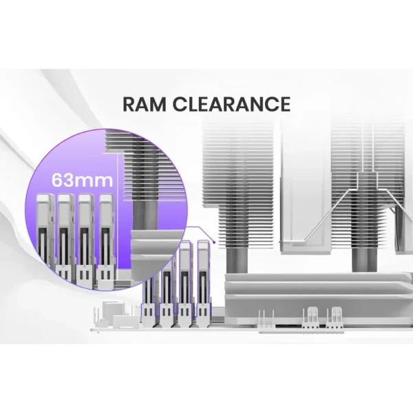 Installation is hassle-free, making it easy to upgrade your system. The FROZN A620 ARGB White is highly compatible, supporting a wide range of current and next-generation sockets, including Intel LGA1851, 1700, and AMD AM5/AM4. With $63text{mm}$ of RAM clearance in a single-fan configuration, it provides flexibility for builders using high-profile memory kits.