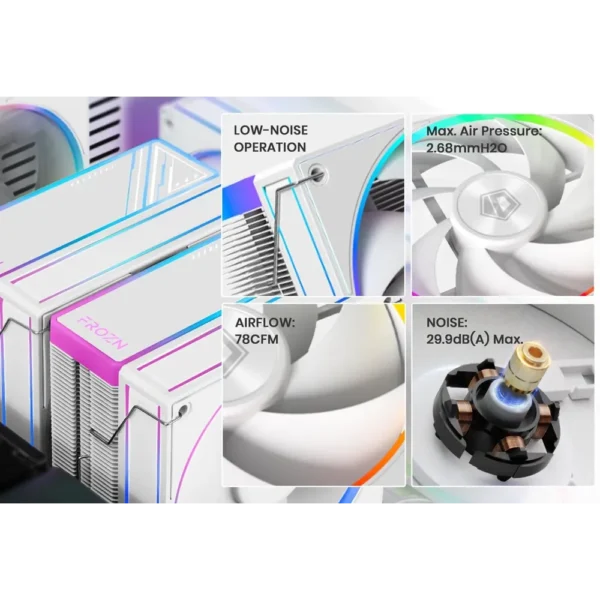 Cooling the large dual-tower heatsink are two high-speed $120text{mm}$ FDB (Fluid Dynamic Bearing) fans. These fans provide exceptional airflow (Max. $78text{CFM}$) and static pressure ($2.68text{mmH}_2text{O}$), all while maintaining a low maximum noise level of $29.9text{dB(A)}$ for a quieter computing experience. The PWM function allows for automatic speed control, optimizing cooling performance and noise reduction dynamically. The stunning white finish paired with vibrant ARGB lighting on the top cover and fans makes the FROZN A620 ARGB White a standout component in any white-themed or illuminated build.