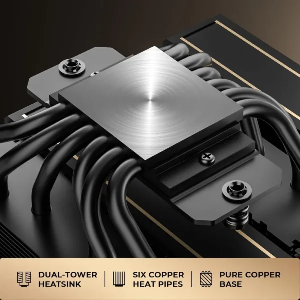Premium Cooling: Experience superior heat dissipation with the dual-tower design and six $Phi6text{mm}$ copper heat pipes of the FROZN A620 GDL Air Cooler.