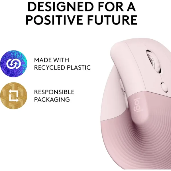 Connect the Logitech LIFT VERTICAL Wireless MOUSE Pink your way. Choose between secure Bluetooth Low Energy or the included Logi Bolt USB receiver. It works seamlessly across Windows, macOS, iPadOS, Chrome OS, and Linux. The Easy-Switch button lets you flow between up to three devices instantly. Enjoy up to two years of battery life from a single AA battery. Furthermore, the pink model uses 54% certified post-consumer recycled plastic. This purchase helps support a more sustainable future. This mouse has been approved by leading ergonomists, confirming its superior design for your health and comfort.