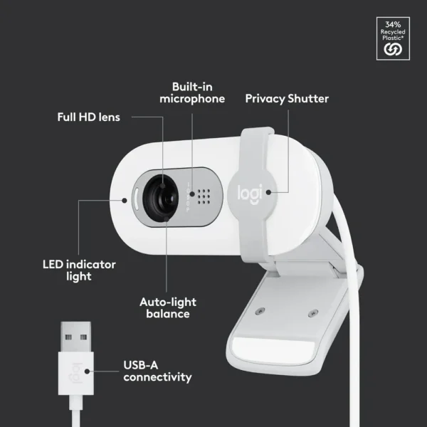 Logitech Brio 100 White Full HD 1080p Webcam with Auto-Light Balance, Privacy Shutter & Built-in Mic for Video Calls