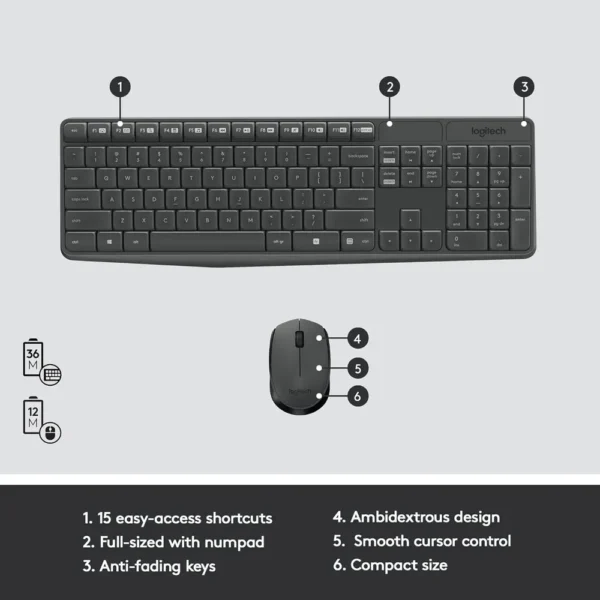 Experience effortless typing with the full-sized keyboard layout featuring smooth, curved keys and a complete number pad. The Logitech MK235 Wireless Combo includes 15 function keys accessible through the “Fn” key, giving you quick access to essential shortcuts. The familiar layout requires no learning curve, allowing you to work productively from day one.