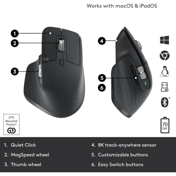 Power through your projects without constant worry about battery life. A full charge delivers up to seventy days of use. If the battery runs low, a quick one-minute charge provides three full hours of operation. The included USB-C cable makes charging simple and modern. The Logitech MX Master 3S is more than a tool; it is your partner in achieving a seamless, powerful, and quiet computing experience across all your devices.