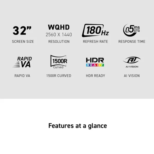 - 32-inch QHD (2560 x 1440) Rapid VA curved panel for immersive visuals and vibrant colors