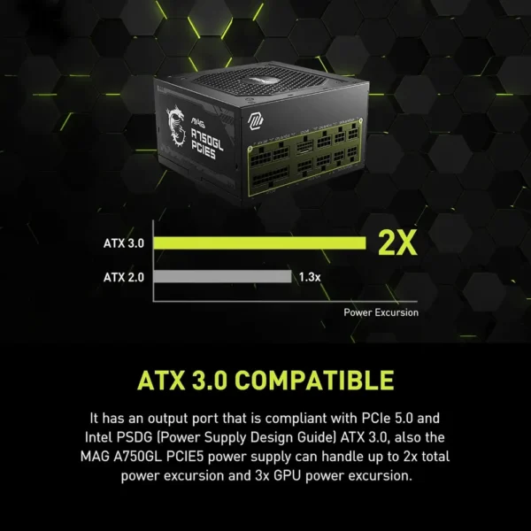 - ATX 3.1 & PCIe 5.1 Ready: The MSI MAG A750GL PCIE 5 features native PCIe 5.1 compatibility with dual-color 16-pin cable, supporting 2x total power excursion and 3x GPU power excursion