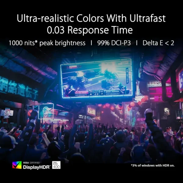 - HDR 400 True Black certified with 1,000 nits peak brightness, 99% DCI-P3 coverage, and Delta E < 2 for stunning color accuracy