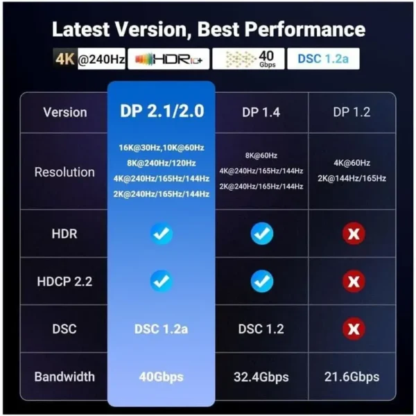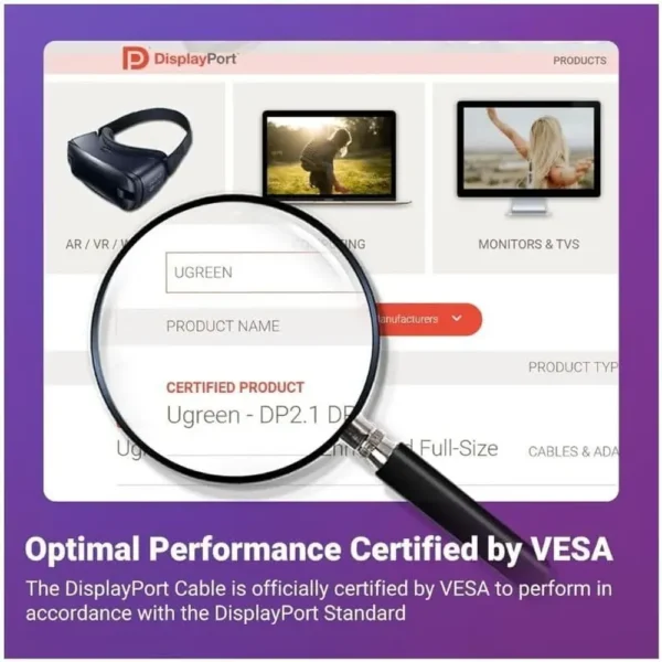 Experience the cutting edge with the UGREEN DisplayPort 2.1 Cable, supporting resolutions up to 16K@30Hz (with DSC 1.2a).