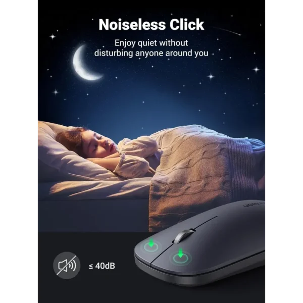 The UGREEN Portable Wireless Mouse Black runs with quiet click buttons that keep your work environment peaceful. The 40dB noise level makes it ideal for office desks, classrooms and shared spaces. You focus better because each click feels soft and smooth.